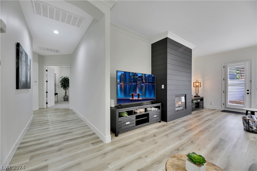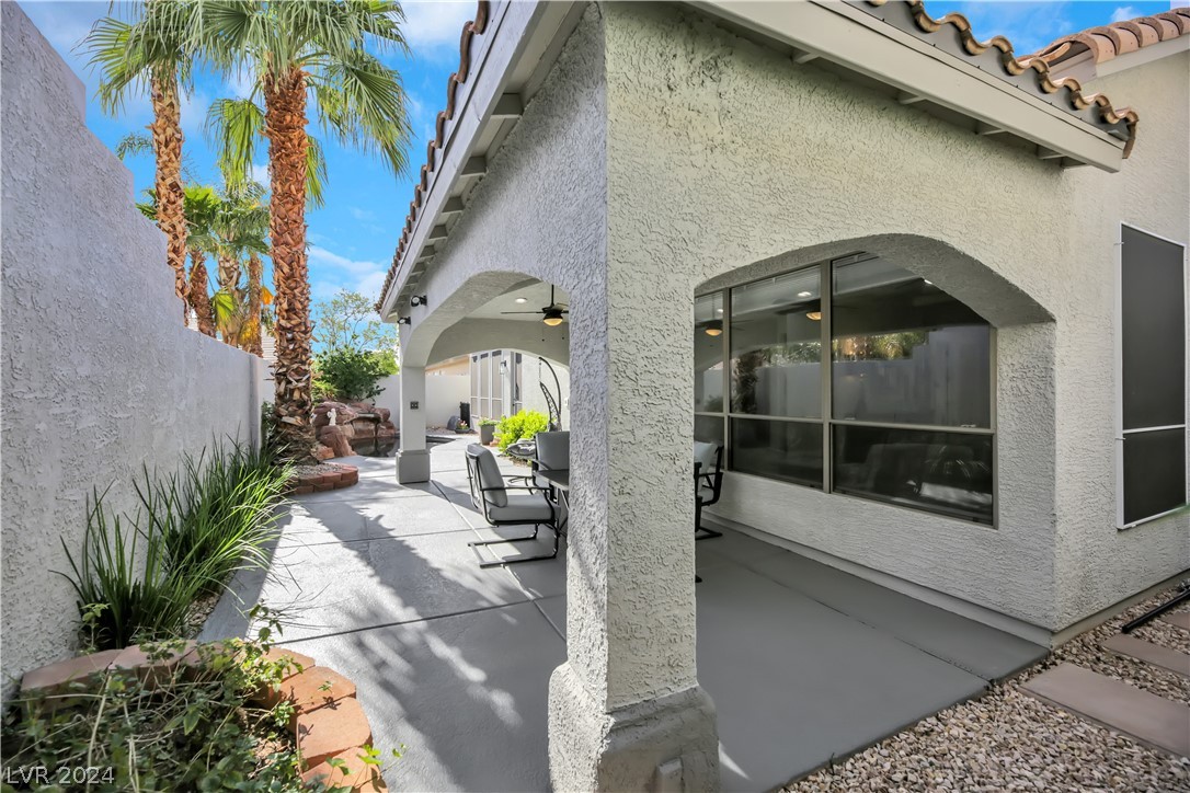 Modern luxury meets timeless charm in this Villa-esque single-story nestled in Green Valley Ranch. Meticulously designed and offered fully furnished, this residence has it all. A stunning gourmet kitchen boasting floor-to-ceiling cabinetry, tiled backsplash with floating shelves, a custom accent range hood, quartz countertops, soft-close drawers, and stainless steel appliances. Two separate dining areas allow for a casual meal by the beautiful bay window, or a more formal space elegantly positioned between the kitchen and a spacious and welcoming living room. Retreat to the exquisite primary bedroom and ensuite featuring a gorgeous rainfall shower and freestanding soaking tub, designed to deliver a personal spa-like experience. Relax or entertain by the resort style pool + soothing waterfall, accompanied by a covered patio equipped with recessed lighting, ceiling fans, and a communal fireplace, allowing for optimal year-round outdoor gatherings.